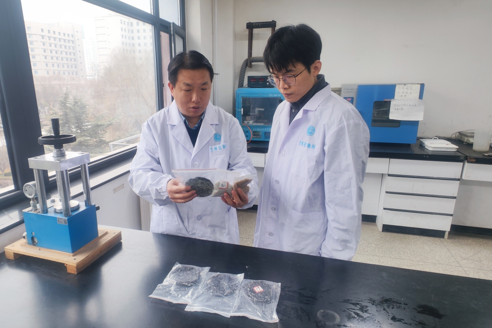 2024年12月26日,唐志誠(chéng)研究員(左一)在中國(guó)科學(xué)院蘭州化學(xué)物理研究所實(shí)驗(yàn)室里向團(tuán)隊(duì)成員介紹處理后的風(fēng)機(jī)葉片材料。受訪者供圖