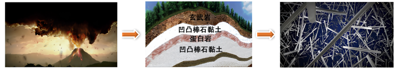 火山噴發(fā)沉積型凹凸棒石的形成過程和棒晶結(jié)構(gòu)示意圖(圖片來源:中國科學院蘭州化學物理研究所)