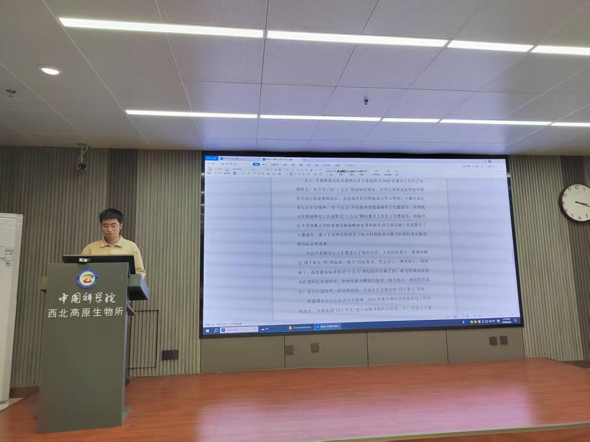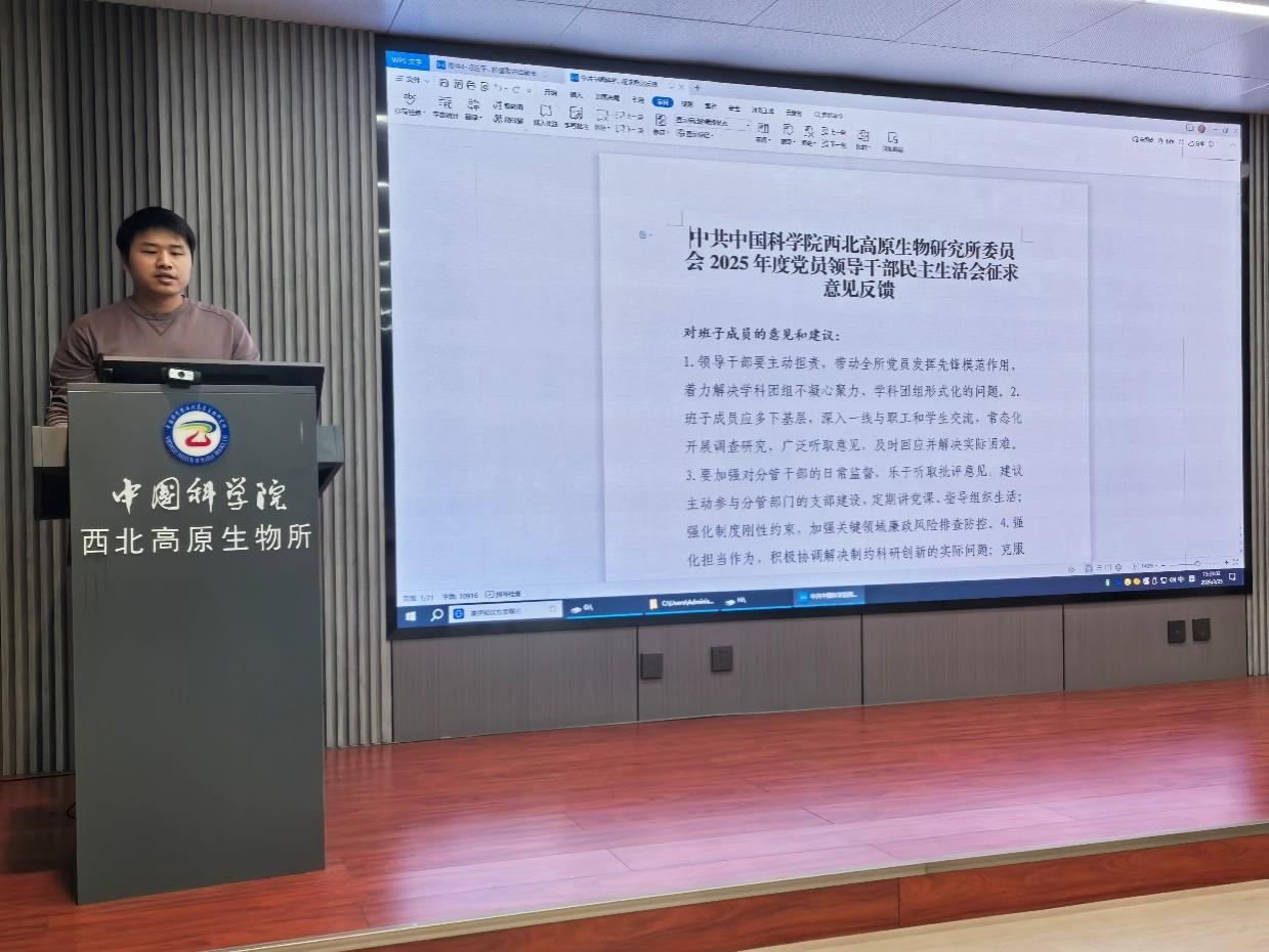 組織委員兼紀(jì)檢委員張昆領(lǐng)學(xué)了習(xí)近平在中共中央政治局第二十四次集體學(xué)習(xí)會(huì)議精神,通報(bào)了《中共中國(guó)科學(xué)院西北高原生物研究所委員會(huì)2025年度黨員領(lǐng)導(dǎo)干部民主生活會(huì)征求意見(jiàn)反饋》。