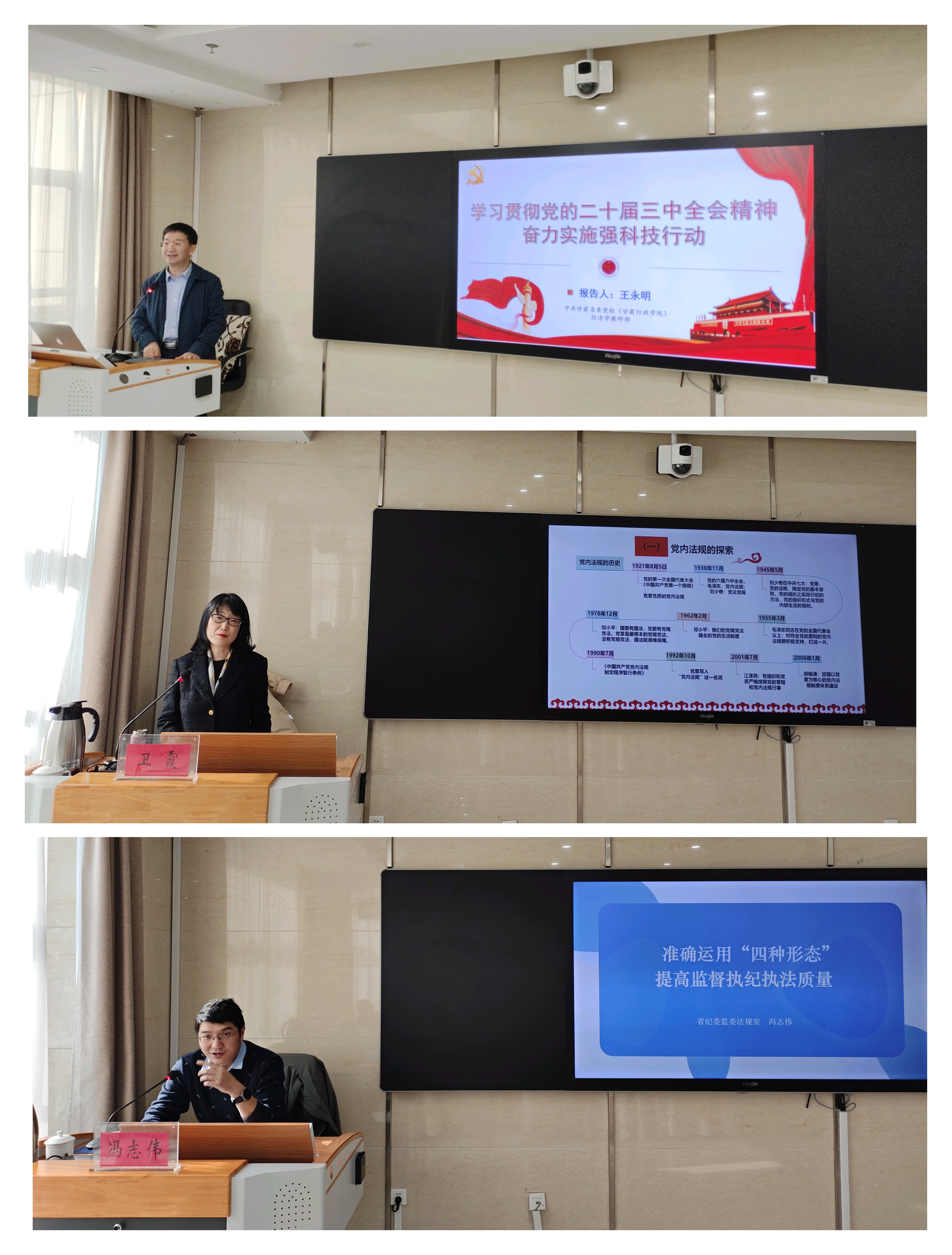 此次培訓結合工作實際設置了三場專題報告、三場經(jīng)驗分享和兩次警示教育。中共甘肅省委黨校(甘肅行政學院)王永明副教授和衛(wèi)霞教授,分別作題為《學習貫徹黨的二十屆三中全會精神 奮力實施強科技行動》和《監(jiān)督執(zhí)紀相關黨內(nèi)法規(guī)解讀》專題報告;甘肅省紀委監(jiān)委法規(guī)室馮志偉作題為《準確運用監(jiān)督執(zhí)紀“四種形態(tài)”》專題報告。