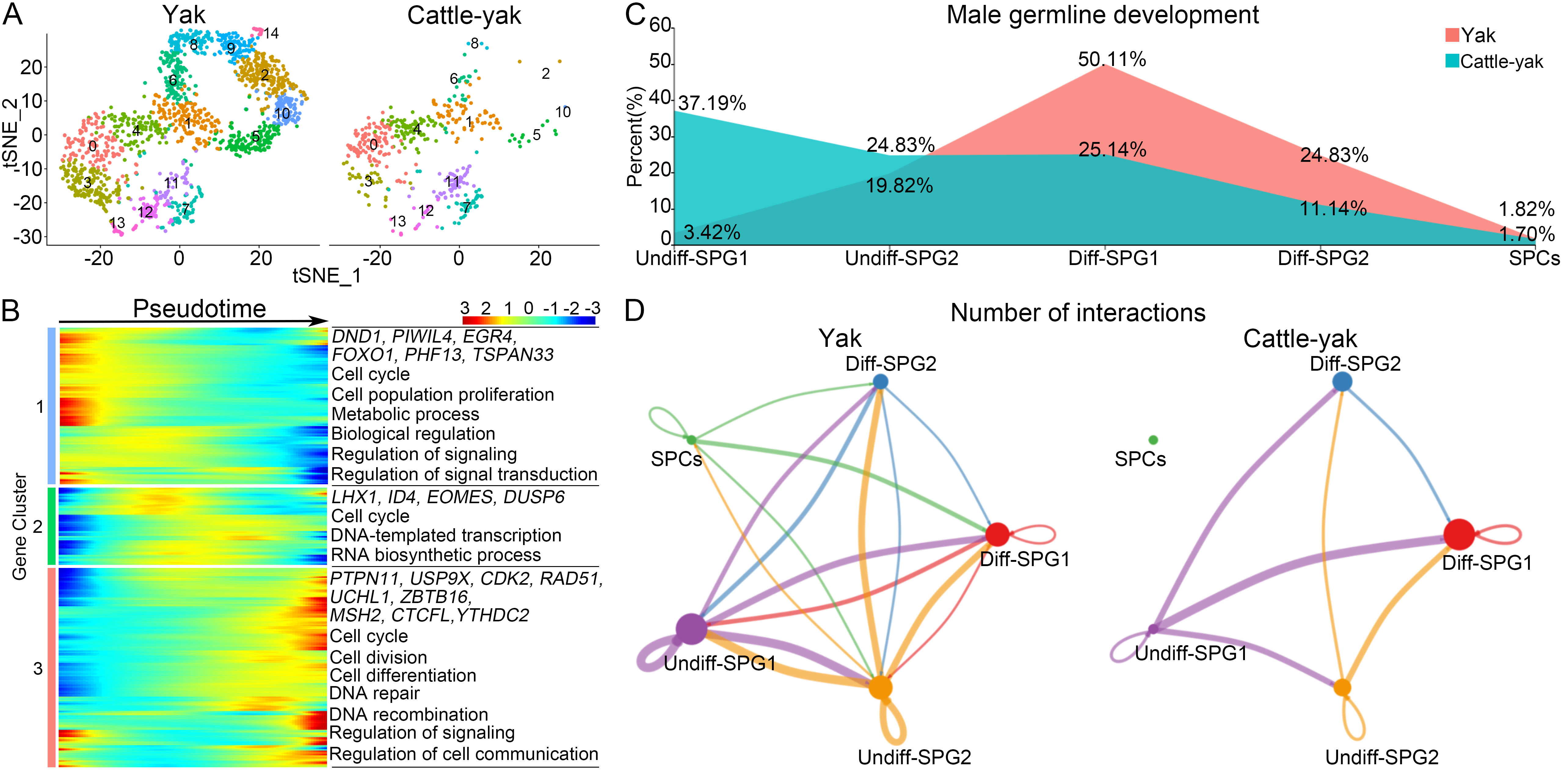 單細(xì)胞轉(zhuǎn)錄組分析揭示犏牛精原細(xì)胞命運決定異常。A:牦牛和犏牛生殖細(xì)胞單細(xì)胞tSNE聚類圖;B:隨擬時序變化的不同類型生殖細(xì)胞基因表達(dá)特征分析;C:兩種牛精原細(xì)胞和早期精母細(xì)胞比例;D:細(xì)胞通訊分析顯示兩種牛不同類型精原細(xì)胞互作存在顯著差異。未分化型精原細(xì)胞1(Undiff-SPG1)、未分化型精原細(xì)胞2(Undiff-SPG2)、分化型精原細(xì)胞1(Diff-SPG1)、分化型精原細(xì)胞2(Diff-SPG2)和精母細(xì)胞(SPCs)