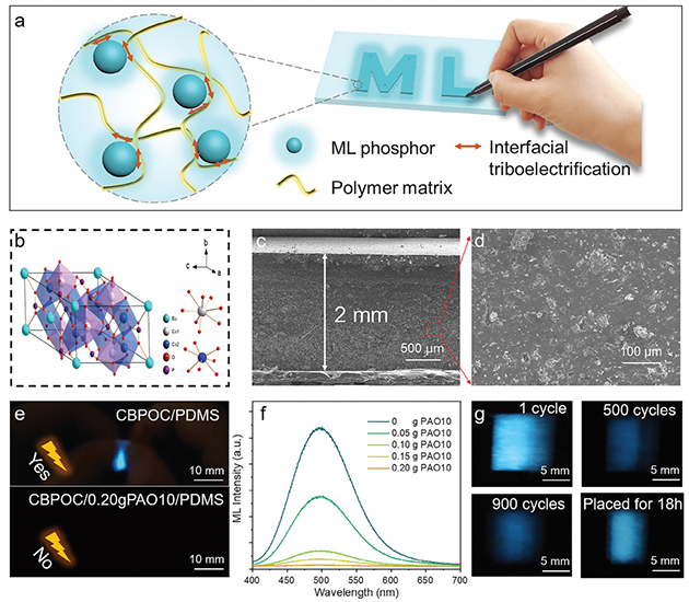 最近,該團(tuán)隊(duì)發(fā)展出了一種基于界面摩擦電場(chǎng)誘導(dǎo)電子轟擊發(fā)光模型的稀土摻雜磷酸鹽基摩擦/力致發(fā)光復(fù)合材料(Ca6BaP4O17:Ce3+/PDMS,圖1)。無(wú)需預(yù)充能,該材料在機(jī)械力學(xué)的刺激下可直接展現(xiàn)出明亮的藍(lán)色摩擦/力致發(fā)光。
