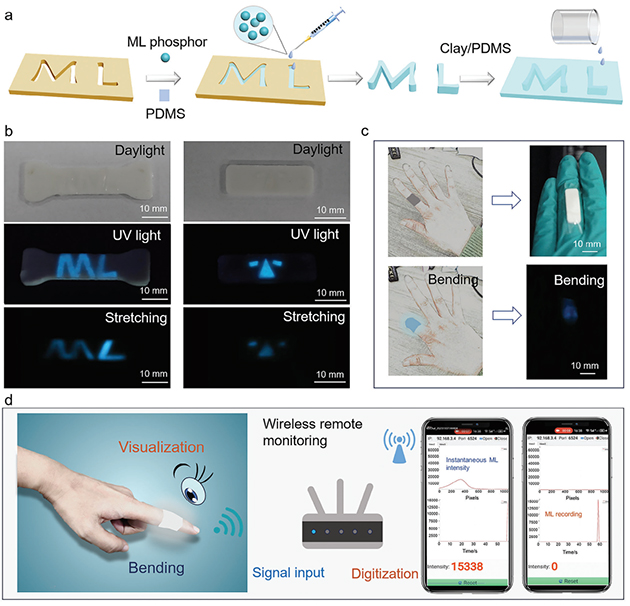 3. Ca6BaP4O17:Ce3+/PDMS材料在信息存儲(chǔ)和光子皮膚方面的應(yīng)用展示。