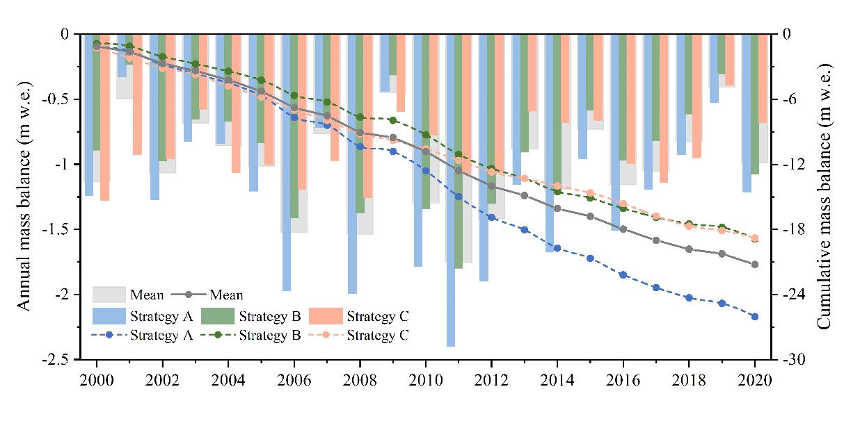 該成果以Historical reconstruction of glacier mass balance and its contribution to water resources in the Sawir Mountains from 2000 to 2020為題發(fā)表于Science of the Total Environment期刊上。碩士研究生余鳳臣為第一作者,王璞玉研究員為通訊作者。該研究獲國家自然科學(xué)基金、中國科學(xué)院青年創(chuàng)新促進(jìn)會優(yōu)秀會員項目、新疆第三次綜合科學(xué)考察項目和冰凍圈科學(xué)國家重點實驗室自主項目等聯(lián)合資助。