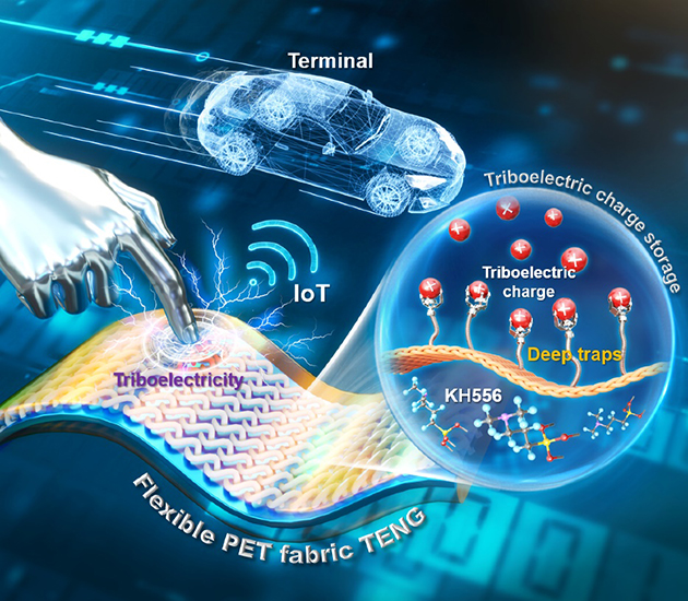 摩擦起電過(guò)程中產(chǎn)生的電荷會(huì)瞬時(shí)存儲(chǔ)在電介質(zhì)表面,進(jìn)而被兩種不同類型的陷阱(淺陷阱和深陷阱)捕獲。其中,淺陷阱中的電荷容易逸出,優(yōu)先耗散到環(huán)境中,而深陷阱中的電荷則因?yàn)闃O難逸出,可長(zhǎng)期儲(chǔ)存。因此,影響摩擦層電荷耗散率的關(guān)鍵因素是陷阱捕獲電荷和被捕獲電荷的逃逸能力?;诖耍搱F(tuán)隊(duì)通過(guò)系統(tǒng)研究,揭示了載流子深陷阱在摩擦電荷存儲(chǔ)中的機(jī)制,通過(guò)分子自組裝技術(shù)在織物摩擦層界面構(gòu)建載流子深陷阱的方式增加TENG的電輸出,將該織物TENG用于物聯(lián)網(wǎng)可穿戴電子設(shè)備的電源模塊,實(shí)現(xiàn)了對(duì)機(jī)械運(yùn)動(dòng)的穩(wěn)定控制。相關(guān)研究成果發(fā)表在Advanced Materials(2024,2303389)上。