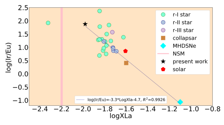 研究人員發(fā)現(xiàn)CEJSNe是目前最強的超鑭元素合成地點。在提取了被標定為r-過程增強星的天文觀測量及相關理論模型值后,研究發(fā)現(xiàn) CEJSNe與其它理論模型呈現(xiàn)出很好的反關聯(lián)關系。這表明,豐富的稀土元素和超鑭元素不能同時出現(xiàn)在同一次r-過程核合成中。研究同時指出,如果沒有CEJSNe,r-過程增強星的觀測值將很難被理論模型解釋,因此該研究進一步提升了r-過程核合成理論的完備性。