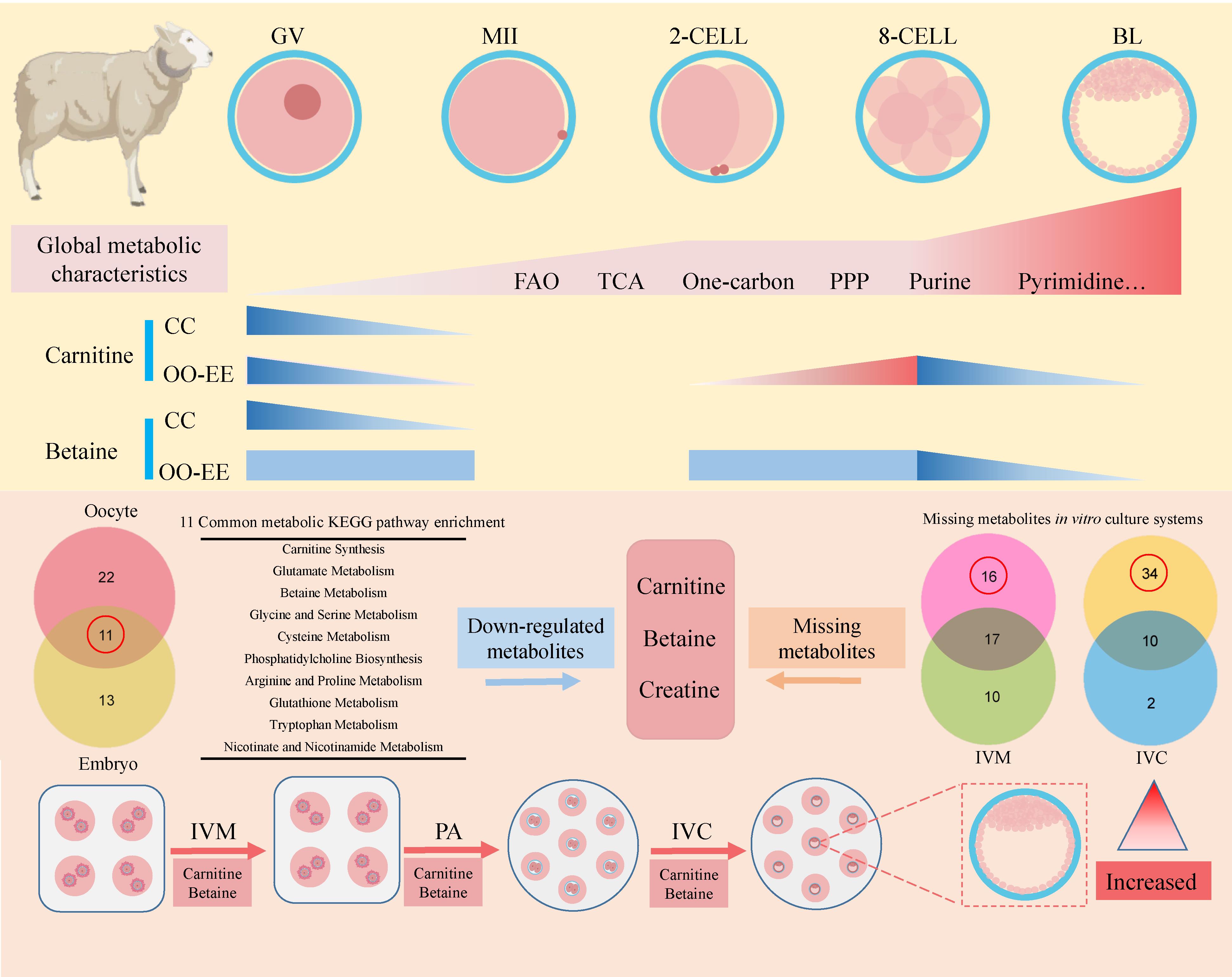 中國科學院西北高原生物研究所動物生態(tài)與資源保護研究團隊與四川農業(yè)大學動物科技學院團隊合作,通過利用超靈敏微量代謝組學技術和單細胞轉錄組學技術,對綿羊卵母細胞體外成熟及早期胚胎體外發(fā)育的代謝特征進行了解析,發(fā)現(xiàn):從GV期卵母細胞至2-細胞胚胎階段整體代謝水平呈上升趨勢,為促進卵母細胞成熟和合子發(fā)育提供了必要的代謝底物;而在2-細胞胚胎至8細胞胚胎階段,整體代謝表現(xiàn)出安靜狀態(tài),有助于減少氧化應激對細胞的損傷;在8-細胞胚胎至囊胚階段,整體代謝水平又明顯增加,為早期囊胚的形成、增殖分化以及表觀修飾過程提供能量和所需的代謝底物。同時,鑒定出肉毒堿、甜菜堿和肌酸為該體外培養(yǎng)系統(tǒng)所缺失的關鍵代謝物。進一步研究發(fā)現(xiàn),肉毒堿可促進綿羊卵母細胞脂肪酸氧化,并降低脂質含量和脂質過氧化水平,同時還可以調節(jié)紡錘體形態(tài)。而甜菜堿則具有調節(jié)綿羊早期胚胎發(fā)育過程中滲透壓應激和甲基化修飾的作用。當聯(lián)合肉毒堿與甜菜堿添加至體外培養(yǎng)體系時,顯著提高了綿羊卵母細胞的囊胚發(fā)育率。該研究結果為提高卵母細胞成熟和胚胎培養(yǎng)提供了新的視角。
