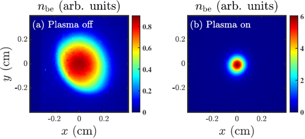 實(shí)驗(yàn)中,基于高能電子成像實(shí)驗(yàn)平臺(tái),科研人員利用熱陰極微波電子槍產(chǎn)生的電子束及高壓直流放電等離子體靶,成功觀察到電子束在有源等離子體透鏡中的聚焦現(xiàn)象,同時(shí)對其聚焦原理深入分析。實(shí)驗(yàn)結(jié)果表明(圖1):當(dāng)?shù)入x子體靶不放電時(shí),YAG屏上的束斑為1.25 mm,而該靶調(diào)節(jié)至合適的放電電壓和氣壓后,束斑減小至0.48mm,聚焦效果顯著!