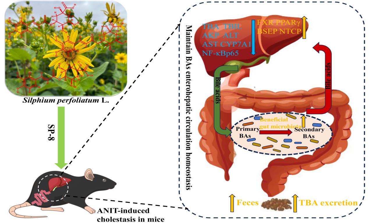 研究結(jié)果以?Caffeoylquinic acids from Silphium perfoliatum L. show hepatoprotective effects on cholestatic mice by regulating enterohepatic circulation of bile acids?為題,于9月30日在線發(fā)表于Journal of Ethnopharmacology(中國科學(xué)院二區(qū)期刊, 2023年影響因子/JCR分區(qū):4.8/Q1)。西北高原所與青海大學(xué)聯(lián)合培養(yǎng)的博士研究生張國英為第一作者,西北高原所趙曉輝研究員為通訊作者。同時該研究也申請了相關(guān)發(fā)明專利3件。該工作得到了青海省科技廳科技成果轉(zhuǎn)化專項和青海省“昆侖英才”人才計劃的資助和支持。