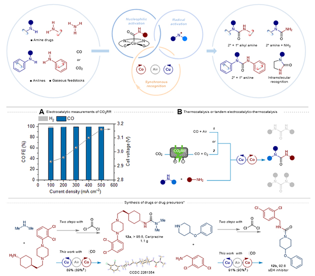 (A)底物適用范圍。(B)從CO2出發(fā)經由CO合成非對稱脲的電熱耦合過程。(C)小分子成藥非光氣路線合成。