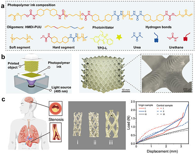 研究人員通過在聚氨酯前驅(qū)體中引入了脲基和酯基,發(fā)展了多重氫鍵誘導的可快速光固化3D打印的超分子聚氨酯彈性體,獲得的彈性體具有優(yōu)異的高彈性、高強度、韌性以及良好的生物相容性和血液相容性。具有高精度光固化3D打印性能的聚氨酯彈性體綜合了高性能與快速結(jié)構(gòu)制造方面的優(yōu)勢,為具有優(yōu)異抗壓縮承載能力和機械穩(wěn)定性等特性的復雜柔性結(jié)構(gòu)生物醫(yī)療器械的制造提供了新的材料技術方案。