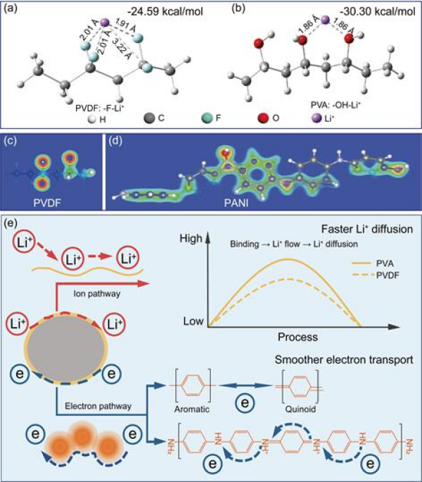 針對(duì)電化學(xué)吸附過程中電極內(nèi)Li+擴(kuò)散速率和電子轉(zhuǎn)移速率不匹配,從而制約電極電化學(xué)活性的問題,設(shè)計(jì)和制備了離子和電子雙導(dǎo)聚(乙烯醇)-聚苯胺(PVA-PANI)共聚物(CP),并包覆到吸附劑顆粒表面,促進(jìn)Li+擴(kuò)散和電子轉(zhuǎn)移,實(shí)現(xiàn)吸附效率的提高。HMO@CP電極具有優(yōu)越的電化學(xué)活性和吸附效率,吸附容量高達(dá)49.48 mg/g。機(jī)理研究表明,PVA中帶負(fù)電荷的羥基(-OH)可以富集Li+并加速Li+的擴(kuò)散,PANI中的共軛結(jié)構(gòu)和氧化還原活性醌類位點(diǎn)提供了更密集的電子分布促進(jìn)電子轉(zhuǎn)移(圖1)。該工作以離子擴(kuò)散和電子轉(zhuǎn)移為出發(fā)點(diǎn),以提高離子擴(kuò)散速率和電子轉(zhuǎn)移速率匹配度為導(dǎo)向,實(shí)現(xiàn)吸附效率的提高(ACS Nano,18?。?024) 31204-31214)。