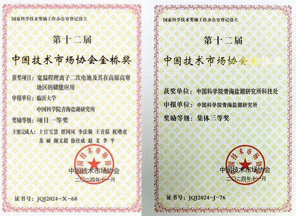 12月14日,由中國技術(shù)市場協(xié)會主辦的第十二屆中國技術(shù)市場協(xié)會金橋獎表彰獎勵大會在北京舉行,中國科學(xué)院青海鹽湖研究所獲項目獎1項、集體獎1項?!皩挏爻啼囯x子二次電池及其在高原高寒地區(qū)的儲能應(yīng)用”項目獲“項目一等獎”,科技處獲“集體三等獎”。