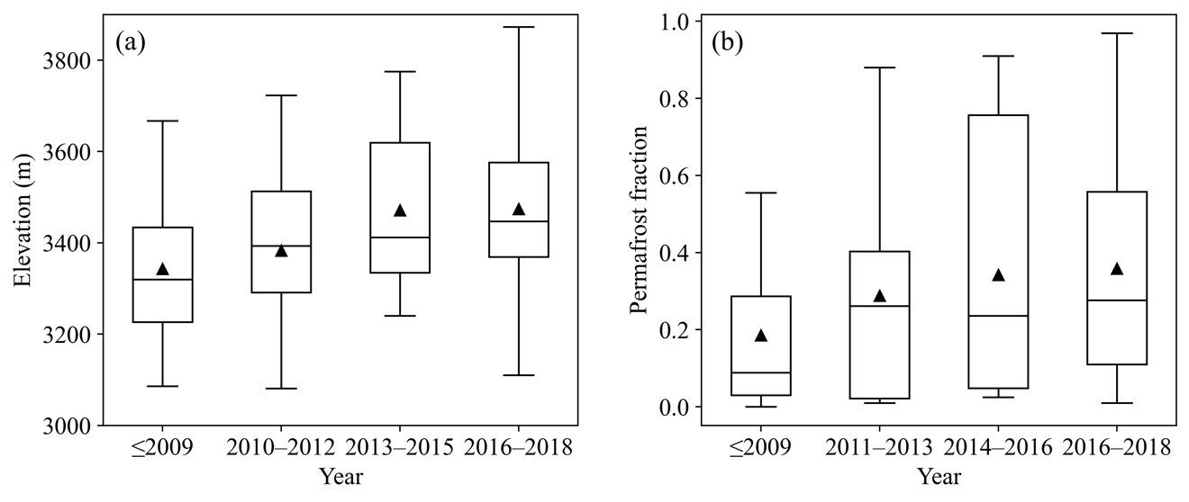 圖2:(a) 不同時(shí)期滑坡事件的海拔變化;(b) 滑坡事件對(duì)應(yīng)的多年凍土變化趨勢(shì)