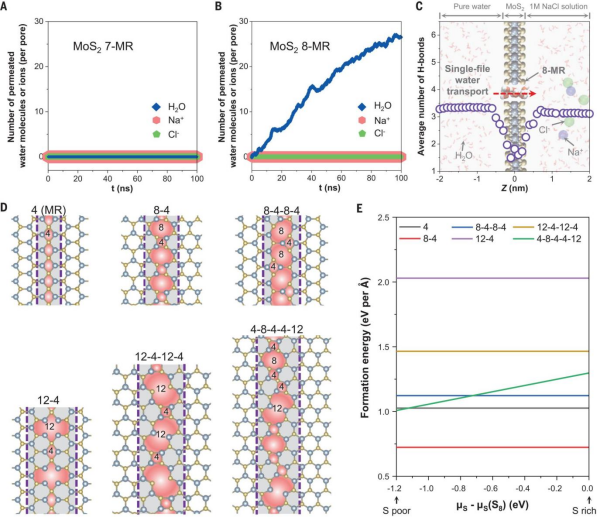研究團(tuán)隊(duì)結(jié)合分子動(dòng)力學(xué)模擬和密度泛函理論計(jì)算,揭示了單層MoS?晶界處形成的八元環(huán)(8-MR)孔結(jié)構(gòu)的尺寸篩分效應(yīng),該孔徑能夠允許單鏈水分子快速通過,同時(shí)完全阻止水合離子(如Na?和Cl?)的通過。因此,單層MoS?晶界處形成的八元環(huán)(8-MR)孔結(jié)構(gòu)可以作為分子篩,有效分離水和離子。實(shí)驗(yàn)過程中,研究團(tuán)隊(duì)通過精確控制MoS?晶粒的生長方向(固定0°或60°的相對(duì)取向),成功在大面積單層MoS?膜中實(shí)現(xiàn)了豐富的8-MR孔結(jié)構(gòu)。通過進(jìn)一步調(diào)節(jié)晶粒生長時(shí)間、硫蒸氣壓力等參數(shù),實(shí)現(xiàn)了對(duì)晶粒尺寸和晶界密度的精確調(diào)控。優(yōu)化后的MoS?膜在多種測試條件下展現(xiàn)出優(yōu)異的性能,如高水滲透性、高離子選擇性以及良好的機(jī)械和化學(xué)穩(wěn)定性。這使得其在海水淡化、污水處理等領(lǐng)域具有廣闊的應(yīng)用前景,為二維材料在分離膜領(lǐng)域的應(yīng)用提供了新的思路。該方法不僅能夠精確控制孔結(jié)構(gòu),還能實(shí)現(xiàn)大面積連續(xù)膜的制備,具有重要的實(shí)際應(yīng)用價(jià)值。