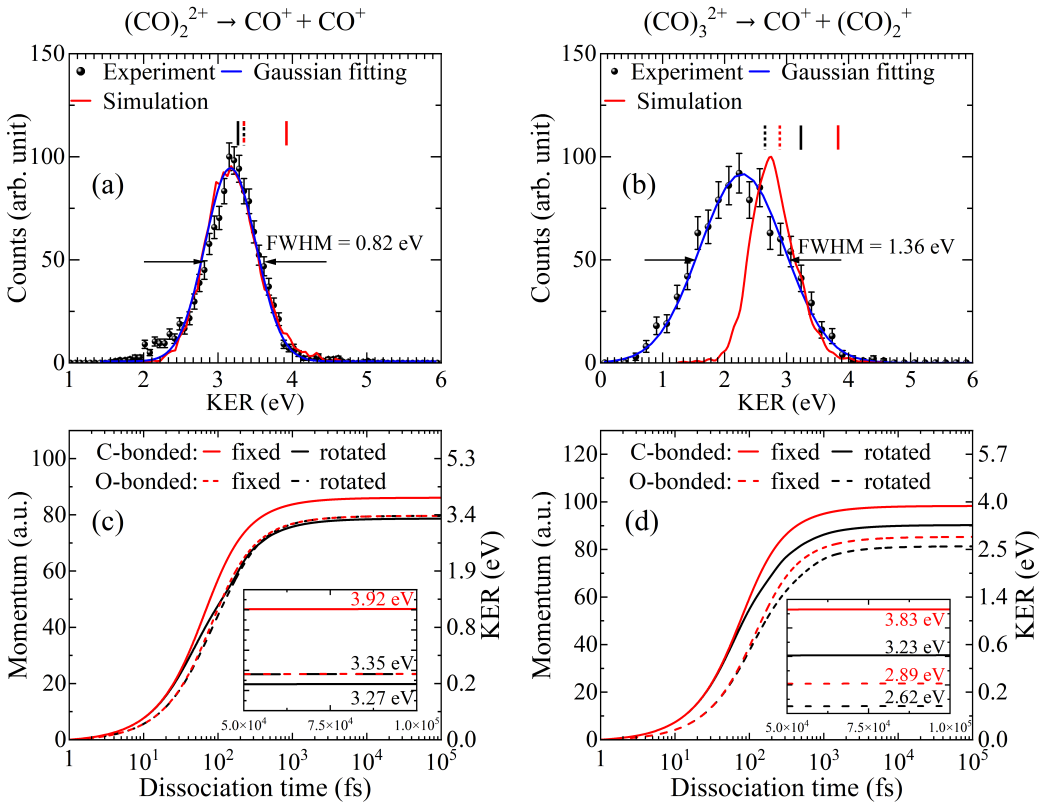 為了解釋這一實驗現(xiàn)象,科研人員在傳統(tǒng)的點電荷模型基礎(chǔ)上,引入了更高階的電荷分布模型,并特別考慮了CO+的電荷分布和電偶極矩。結(jié)果表明,偶極作用誘導(dǎo)了CO?碎片的轉(zhuǎn)動激發(fā)。這種能量傳遞機制充分解釋了實驗與理論之間的差異,同時揭示了庫倫爆炸過程偶極相互作用誘導(dǎo)的CO?碎化。