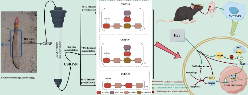 為了解決鎖陽資源利用中存在的上述科學問題,中國科學院西北高原生物研究所青海省藏藥藥理學和安全性評價研究重點實驗室團隊,采用熱水提取、乙醇沉淀分級及柱層析純化相結合的方法,從鎖陽中得到3個多糖組分:CSRP-50、CSRP-70和CSRP-90,隨后對其組成、結構、Hcy誘導成骨細胞氧化損傷保護作用進行研究。組成結構研究結果表明,3個多糖組分均為天然甲基化的α-(1→4),(1→6)-D-葡聚糖,其主鏈由α-1,4-D-Glcp和α-1,6-D-Glcp交替構成。其中,CSRP-50無支鏈結構,CSRP-70和CSRP-90存在由α-1,6-D-Glcp和末端1位連接的α(β)-D-Glcp構成的支鏈,該支鏈結構連接在主鏈α-1,4-D-Glcp的O-6位。藥理活性研究結果表明,CSRP-50、CSRP-70和CSRP-90均可通過激活Keap1/Nrf2信號通路,增強成骨細胞抗氧化能力,進而保護成骨細胞對抗Hcy誘導的氧化應激損傷,表現(xiàn)出很好的抗骨質疏松作用潛力。該研究為鎖陽及其多糖成分在抗骨質疏松癥方面的進一步研究與利用提供科學依據(jù)。