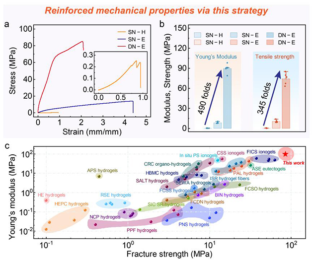 超強凝膠通常模量和強度較高,但力學韌性一直是挑戰(zhàn)。該研究通過將低共熔溶劑(DES)引入半結晶性PVA水凝膠中進行機械訓練,實現(xiàn)了超高強度與優(yōu)異韌性的兼容(圖1)。在溶劑置換過程中,通過氫鍵重構促進PVA結晶增強,形成密集的納米晶域并賦予超滯后效應,實現(xiàn)單次預伸展的“超滯后介導的機械訓練”。同時,得益于超滯后的結構阻滯效應,機械訓練后的單網(wǎng)絡凝膠還可進一步浸泡前驅液,并通過自由基聚合構建化學交聯(lián)的第二網(wǎng)絡形成層級互穿。此層級互穿的雙網(wǎng)絡結構賦予凝膠材料微觀協(xié)同介觀的多尺度能量耗散特性,極大地提升了力學性能,其斷裂強度達~ 85.2 MPa、楊氏模量為~ 98 MPa、斷裂韌性提升至~ 130.6 MJ·m?3,遠優(yōu)于目前報道的強韌聚合物凝膠體系(圖2)。