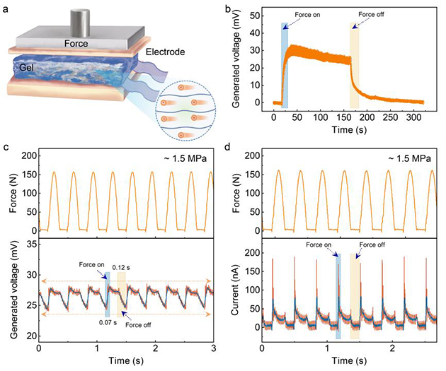 界面之間的運動、行為會耗散大量的機械能,比如界面摩擦,潤滑是減小能源消耗的有效途徑。然而,對于一些極端工況,界面的機械耗散是不可避免的,為此,針對極端環(huán)境下的高承載或高抗沖擊工程軟材料需求,超滯后介導的機械訓練構建的超強共晶凝膠可通過力電轉導的方式收集機械能,并將轉化的電能作為傳感信號反映壓力應變(圖3),該研究展示了共晶凝膠在高溫環(huán)境中的力學穩(wěn)定性及作為離子壓電機械感受器在壓力驅動力電轉導的響應性能,實現(xiàn)了強韌力學與電學性能之間的力?電耦合的協(xié)同設計,為性能和功能的適配耦合提供了全新的設計范式和構建策略。