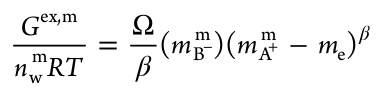 研究人員受Pierre-Gilles de Gennes聚合物標度理論[5]進一步啟發(fā),提出“標度正規(guī)溶液理論”(即,膜相中“有效自由反離子濃度”與“表觀自由反離子濃度”間的冪律關系),用以描述溶脹離子交換膜內自由離子相互作用的超額吉布斯(Gex,m)自由能(式3):