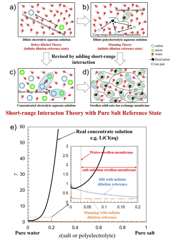 受Kenneth S. Pitzer濃電解質溶液理論啟發(fā),研究人員認為:離子交換膜的反離子凝聚效應相較曼寧理論所描述的稀聚電解質溶液要強的多;在純水溶脹的離子交換膜中,絕大多數的反離子處于凝聚狀態(tài),有效的屏蔽了聚合物鏈上的電荷。因此,自由離子之間的短程作用,而非長程靜電作用,才是決定性的。這點與忽略長程靜電作用的濃電解質溶液理論完全一致。據此,研究人員創(chuàng)新性提出了"純水溶脹膜參考態(tài)"——首次明確區(qū)分了膜內反離子與溶液相中反離子的標準化學勢。