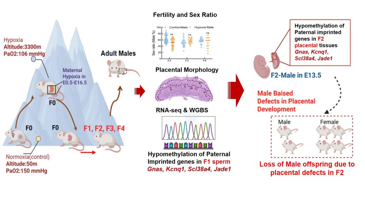 為探究母體低氧環(huán)境暴露對(duì)子代的跨代影響,中國(guó)科學(xué)院西北高原生物研究所動(dòng)物生態(tài)與資源保護(hù)研究團(tuán)隊(duì)建立了孕期低氧暴露小鼠模型,將經(jīng)歷過(guò)孕期低氧暴露的小鼠(F0)轉(zhuǎn)運(yùn)至低海拔后,出生的雄性小鼠和對(duì)照雌鼠合籠,連續(xù)飼養(yǎng)四代(F1-F4)。從2018年 9月到 2023年 8月,通過(guò)大量出生性別統(tǒng)計(jì)和不同發(fā)育階段的性別鑒定,發(fā)現(xiàn)母體孕期低氧暴露會(huì)造成F2代雄性個(gè)體顯著減少。進(jìn)一步的分析發(fā)現(xiàn)F2雄性減少是由于在胚胎期13.5天發(fā)生的胚胎特異性丟失。雄性胚胎丟失的主要原因?yàn)樘ケP(pán)形態(tài)和功能異常。研究團(tuán)隊(duì)通過(guò)胎盤(pán)轉(zhuǎn)錄組和全基因組DNA甲基化測(cè)序聯(lián)合分析,發(fā)現(xiàn)父源印記基因Slc38a4,Gnas,Jade1 和Kcnq1表達(dá)異常。隨后,通過(guò)對(duì)F1代小鼠成熟精子與F2代雄性胎盤(pán)全基因組DNA甲基化進(jìn)行聯(lián)合分析,結(jié)果發(fā)現(xiàn)以上印記基因DNA甲基化模式高度相似。這說(shuō)明經(jīng)歷胚胎期低氧的F1代雄性小鼠的精子存在甲基化異常,并且可以進(jìn)一步影響F2雄性個(gè)體生長(zhǎng)發(fā)育進(jìn)而導(dǎo)致性別比例異常。該工作系統(tǒng)地揭示母體低氧暴露對(duì)F1及F2代發(fā)育影響的跨代遺傳機(jī)制,為深入理解高原低氧暴露的生殖和健康風(fēng)險(xiǎn)提供了新的表型數(shù)據(jù)。