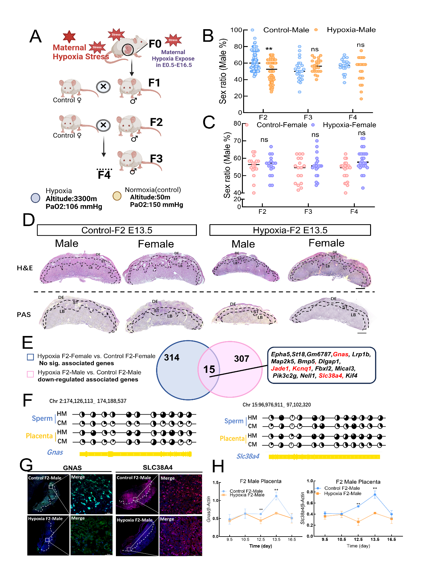文章代表圖片A:低氧暴露及傳代實(shí)驗(yàn)?zāi)J綀D;B:F2-F4代雄性組胚胎出生性別比例統(tǒng)計(jì);C:F2-F4代雌性組胚胎出生性別比例統(tǒng)計(jì);D:H&E染色分析F2代E13.5不同性別小鼠胎盤(pán)形態(tài);EWGBS與轉(zhuǎn)錄組聯(lián)合分析篩選差異父源印記基因;F候選基因在F1精子和F2胎盤(pán)中甲基化位點(diǎn)的甲基化水平;G候選基因在E13.5胎盤(pán)中的蛋白表達(dá)免疫熒光染色;H候選基因在F9.5-E16.5胎盤(pán)中的基因表達(dá)變化趨勢(shì)。