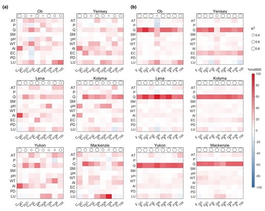 使用隨機森林(RF)模型按%IncMSE排序,確定泛北極河流中顆粒物(碳、氮和懸浮顆粒物)濃度(a)和通量(b)的影響因子