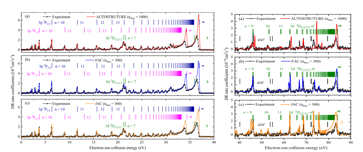 基于蘭州重離子加速器冷卻儲存環(huán)開展的高電荷態(tài)離子的雙電子復合精密譜學實驗具有較高的能量分辨,且其電子-離子相對能量可大范圍精密調(diào)制,是目前唯一能夠精確測量低能碰撞復合截面關鍵數(shù)據(jù)的實驗方法??蒲袌F隊在對M殼層類鈉鐵離子 Fe15+的實驗中,成功測量了 0-90 eV 能量范圍內(nèi)的復合速率系數(shù)。他們將實驗結果與最新的理論Flexible Atomic Code (FAC) 、AUTOSTRUCTURE、Jena Atomic Calculator (JAC)計算的結果仔細對比,解析出每個共振結構的來源。同時,科研人員從雙電子復合速率系數(shù)得到了可用于等離子體建模的等離子體速率系數(shù),并與此前的理論數(shù)據(jù)作了對比研究。