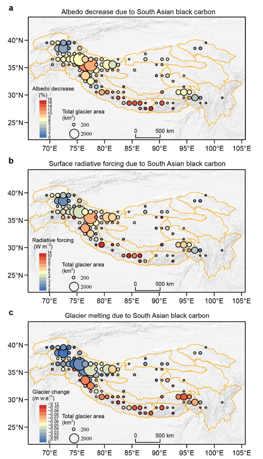 結(jié)果表明,2007至2016年間,南亞黑碳沉降使青藏高原冰川反照率降低,導致消融量增加7.5%;同時南亞黑碳導致的高原降水減少帶來冰川物質(zhì)負平衡(虧損)增多6.1%;其中,喜馬拉雅地區(qū)尤為顯著,冰川物質(zhì)負平衡增幅達到33.7%。冰川物質(zhì)虧損導致陸表水儲量減少,其中青藏高原南部流域陸表水儲量減少顯著,尤其在印度河與恒河-布拉馬普特拉河等內(nèi)流盆地。