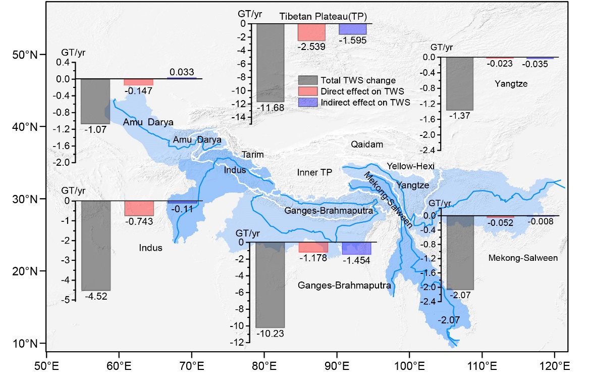 南亞黑碳通過直接消融效應與間接補給效應對青藏高原重點流域陸表水儲量(GT/yr)變化的影響