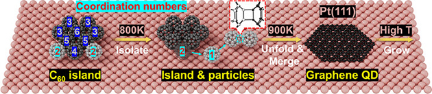 1. Pt(111)上C60島的熱演化示意圖。