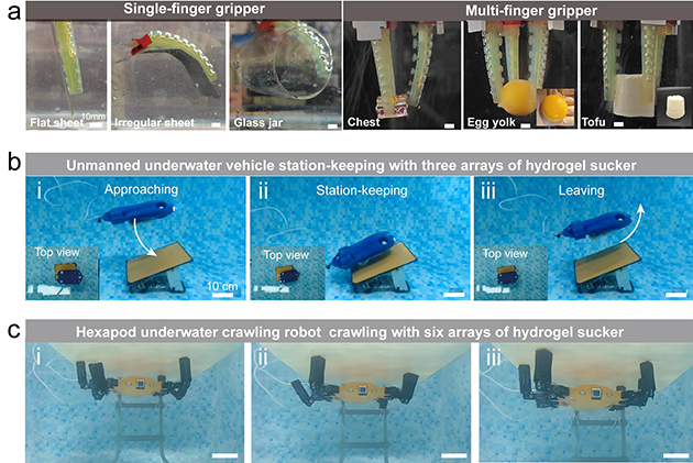 為進一步凸顯非破壞性粘附的實用性,研究人員研制了一款采用液壓驅動、配備仿生吸盤的水凝膠夾持器,可自適應地操縱各種水下物體,不僅能應對曲面復雜的物體,甚至還能溫和處理蛋黃、豆腐塊等極為脆弱的食品。 此外,研究人員將這類水凝膠吸盤陣列結構集成到水下無人航行器的腹部和六足機器人的足端,從而賦予其水下操控物體、定點停留及表面爬行等特殊功能,為復雜海洋環(huán)境場景中的應用提供了高適形、可逆、低損的粘附手段。