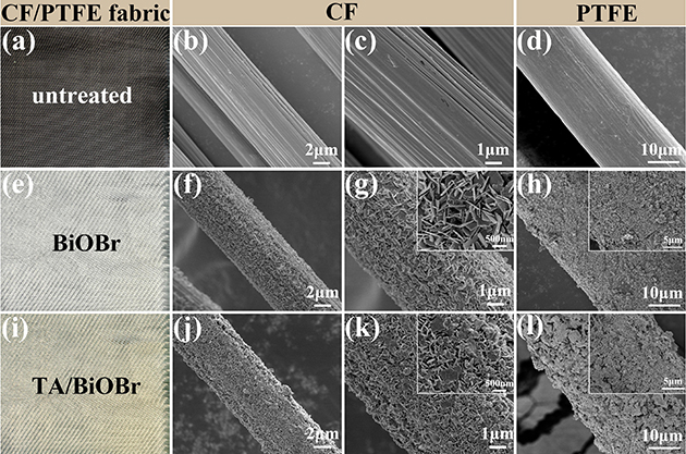 眾所周知,CF和PTFE纖維表面具有強化學(xué)惰性,導(dǎo)致其復(fù)合材料的界面結(jié)合性能差。在上述工作進行摩擦學(xué)性能評價的過程中,存在大量纖維與樹脂基體脫黏拔出的現(xiàn)象,對復(fù)合材料的整體性能的發(fā)揮產(chǎn)生不利影響。近日,研究團隊基于前期研究基礎(chǔ),在界面優(yōu)化改性方面提出了新思路。團隊首次將BiOBr應(yīng)用于摩擦學(xué)領(lǐng)域,并提出了“軟-硬-軟”多級結(jié)構(gòu)的設(shè)計思路,通過化學(xué)浴、水熱生長和層層自組裝方法在CF/PTFE織物表面依次構(gòu)建了化學(xué)交聯(lián)的“軟”基底層(PEI/PA)、垂直取向的“硬”中間層(BiOBr納米片)以及動態(tài)配位的“軟”外層(TA/Fe3+金屬-多酚網(wǎng)絡(luò))。其改性前后的纖維表面形貌如圖1所示。