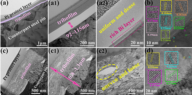 圖2. TA/BiOBr@FC(a)和純FC(c)摩擦膜截面TEM圖像;TA/BiOBr@FC(b)和純FC(d)摩擦膜的HR-TEM圖像