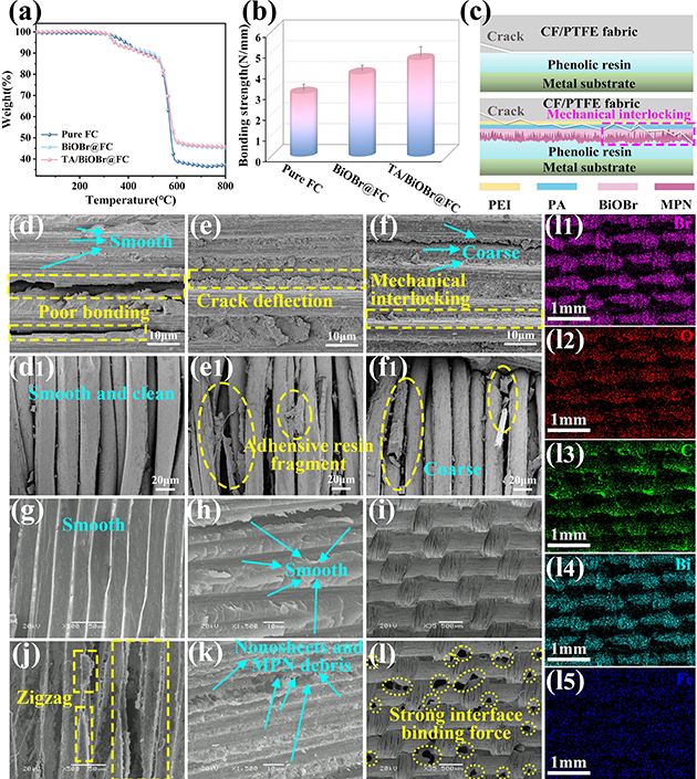 圖3.CF/PTFE纖維織物復(fù)合材料的TGA曲線(a)、粘結(jié)強度(b)和界面增強機理(c);純FC、BiOBr@FC和TA/BiOBr@FC剝離后織物截面上CF(d-f)和PTFE纖維(d1-f1)的SEM圖像;Pure FC(g-i)和TA/BiOBr@FC(j-l)剝離后金屬基板表面的SEM圖像;l的相應(yīng)元素映射(l1-l6)