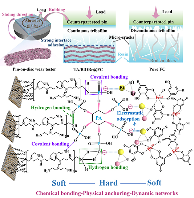 團隊人員在此基礎(chǔ)上提出了在纖維織物表面構(gòu)建“軟-硬-軟”結(jié)構(gòu)增強復(fù)合材料的摩擦學(xué)性能的磨損機理。未經(jīng)改性的復(fù)合材料在受到外部擠壓和剪切力的作用下,出現(xiàn)大量的微裂紋并伴隨纖維嚴重拔出斷裂,隨后在對偶表面形成不均勻不連續(xù)的摩擦膜。而TA/BiOBr@FC經(jīng)由表界面改性,織物界面從微觀到宏觀形成了化學(xué)鍵合-物理錨定-動態(tài)網(wǎng)絡(luò)的多級增強體系,避免纖維-樹脂界面脫黏和纖維拔出,顯著提升了CF/PTFE纖維織物復(fù)合材料的界面性能和摩擦學(xué)性能。