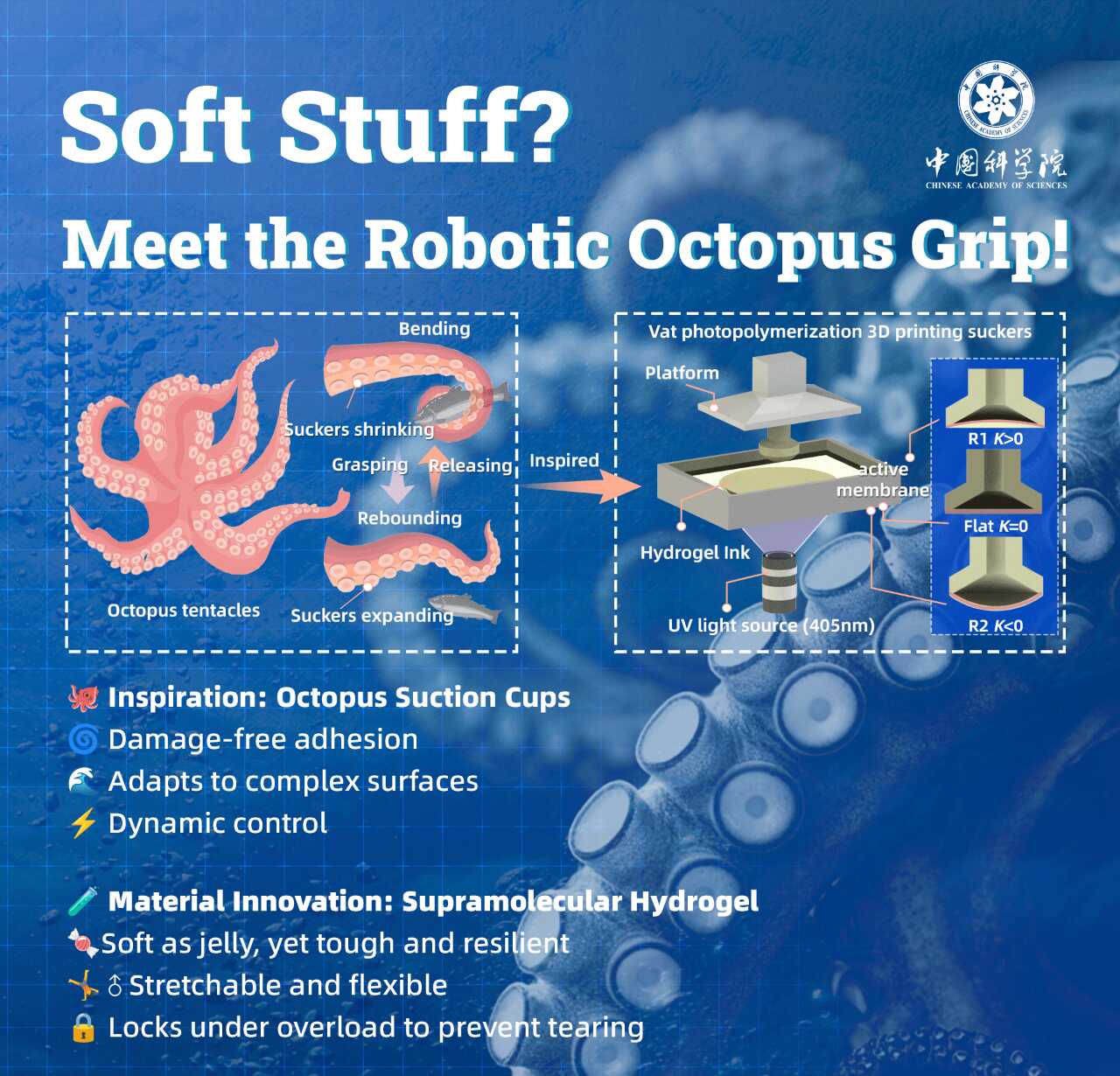 研究人員設(shè)計了一種超分子水凝膠,利用強弱氫鍵的配合,讓材料既柔軟又不容易撕裂。然后,他們用3D打印技術(shù)打印出帶彎曲薄膜和微小通道的吸盤,實現(xiàn)對不同表面的自適應(yīng)貼合和溫和吸附。