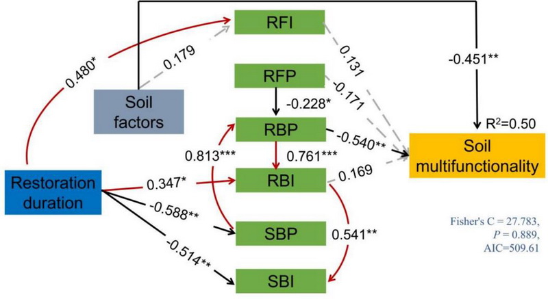 圖1 不同恢復(fù)年限的檸條(Caragana korshinskii)人工林下,恢復(fù)年限、土壤因子以及土壤和根際微生物群落特征對土壤多功能性的影響