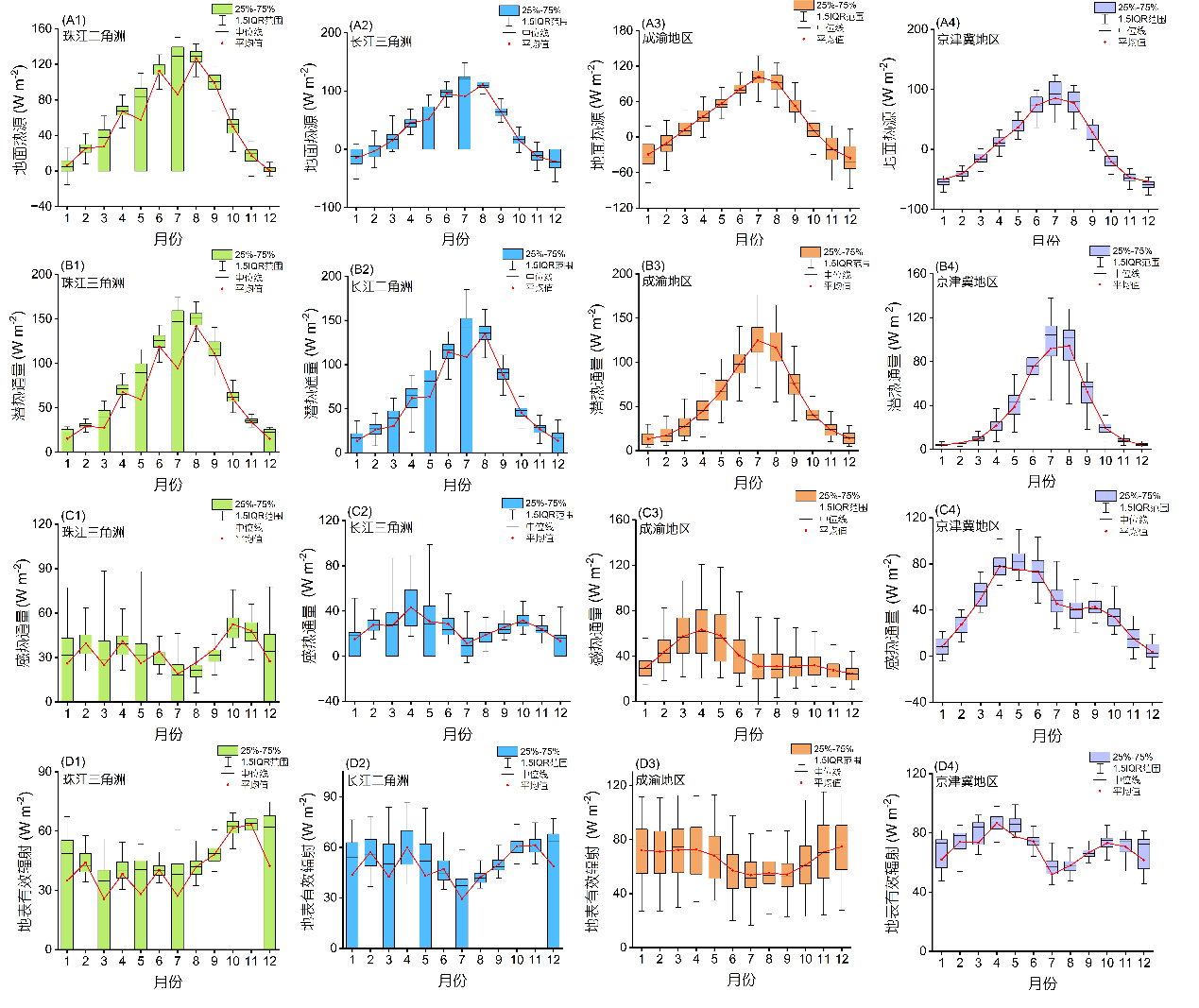 1979–2021年中國4個城市群能量變量的季節(jié)變化特征。(A) 地面熱源;(B) 潛熱通量;(C) 感熱通量;(D) 地表有效輻射。1:珠江三角洲;2:長江三角洲;3:成渝地區(qū);4:京津冀地區(qū);紅色實線為43年月均值