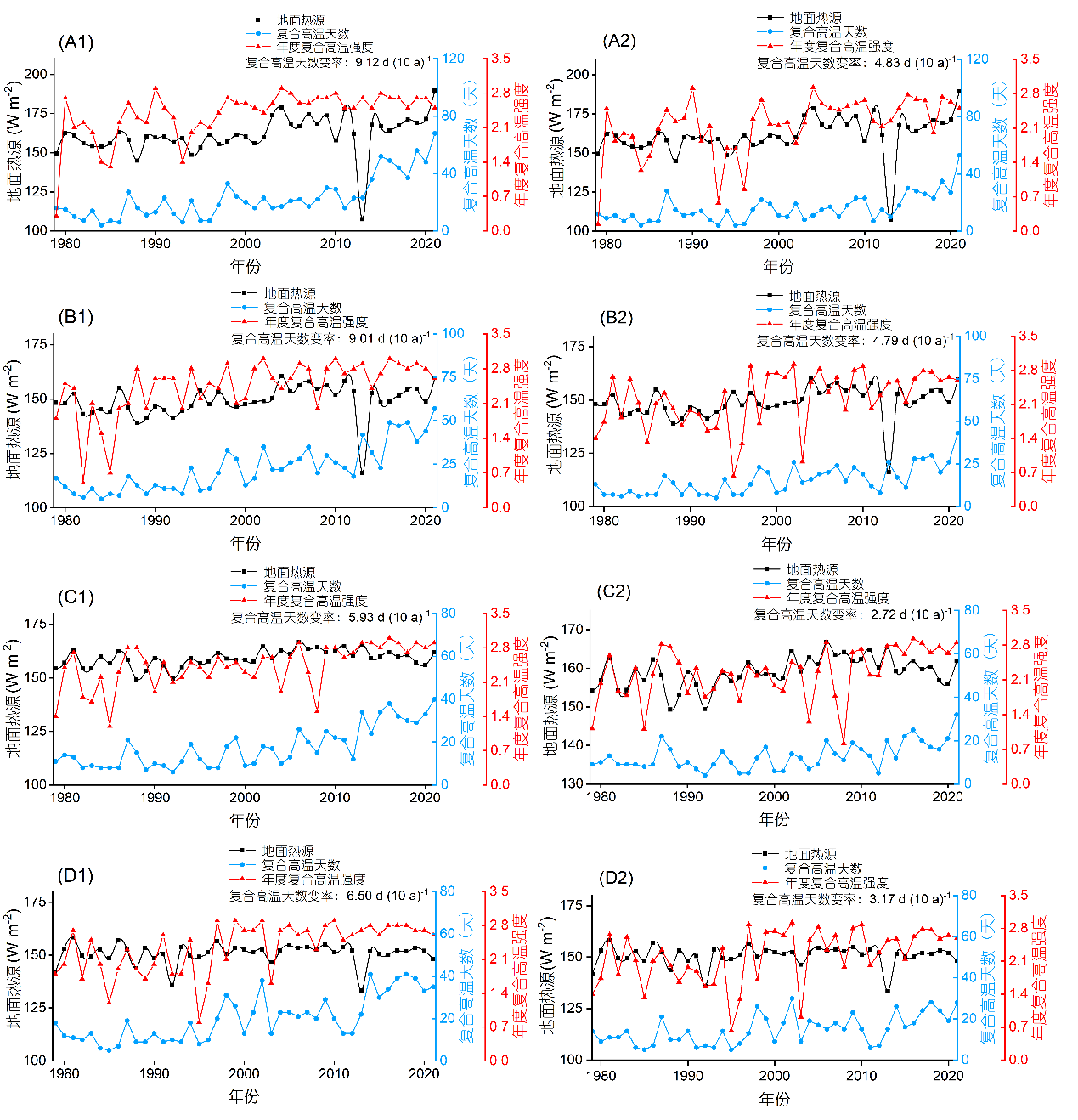 1979–2021年4個城市群地面熱源、復(fù)合高溫天數(shù)和年度復(fù)合高溫強度的年際變化。(A) 珠江三角洲;(B) 長江三角洲;(C) 成渝地區(qū);(D) 京津冀地區(qū)。1:基準(zhǔn)期1981–2010年;2:基準(zhǔn)期1991–2020年