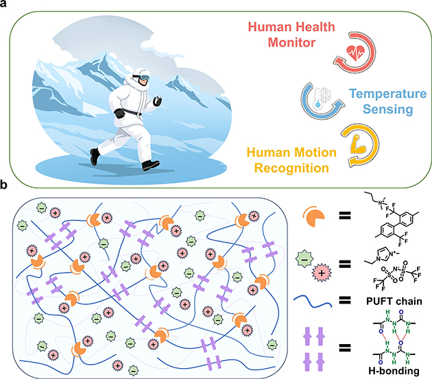 為探索聚氨酯材料的應(yīng)用潛力,基于上述研究,研究人員對(duì)聚氨酯材料內(nèi)部分子網(wǎng)絡(luò)設(shè)計(jì)和功能化進(jìn)行深入研究。為實(shí)現(xiàn)材料的導(dǎo)電性,引入更多具有額外極性的極性鍵是一種可能的策略,如碳-氟(C-F)鍵。由于F原子的高電負(fù)性,C-F鍵的強(qiáng)靜電性質(zhì)會(huì)增強(qiáng)進(jìn)入體系的電子極性,這樣陰離子和陽離子可彼此分布得更遠(yuǎn),在聚合物內(nèi)部移動(dòng)更自由。基于此,研究人員提出了一種分子工程范式,利用氟的雙重功能在聚氨酯基質(zhì)中構(gòu)建空間相關(guān)但功能獨(dú)立的動(dòng)態(tài)網(wǎng)絡(luò)。通過引入含氟擴(kuò)鏈劑和多氫鍵單元,構(gòu)建了氟-陽離子相互作用與高密度氫鍵協(xié)同的動(dòng)態(tài)網(wǎng)絡(luò),氟的高電負(fù)性不僅與封端劑形成離子鍵增強(qiáng)網(wǎng)絡(luò)穩(wěn)定性,還通過偶極相互作用固定陽離子,構(gòu)建陰離子傳輸通道,保障離子高效遷移。從而成功制備了一種具備超敏感多參數(shù)監(jiān)測(cè)功能,可用于極地可穿戴設(shè)備形狀記憶聚氨酯材料。