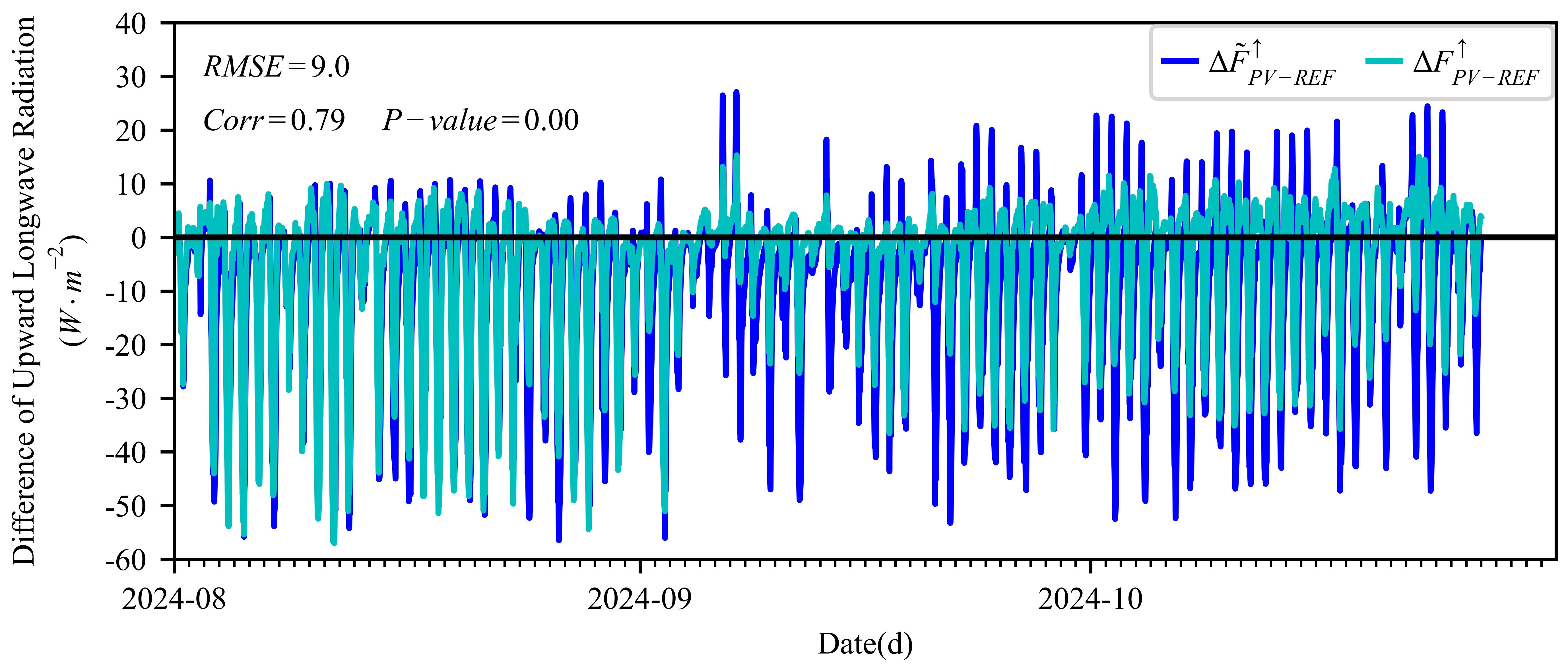光伏電站內(nèi)外向上長波輻射通量密度之差的逐日變化:實測值(?F_(PV-REF)^↑)和PV3R模型輸出值(?F ?_(PV-REF)^↑)