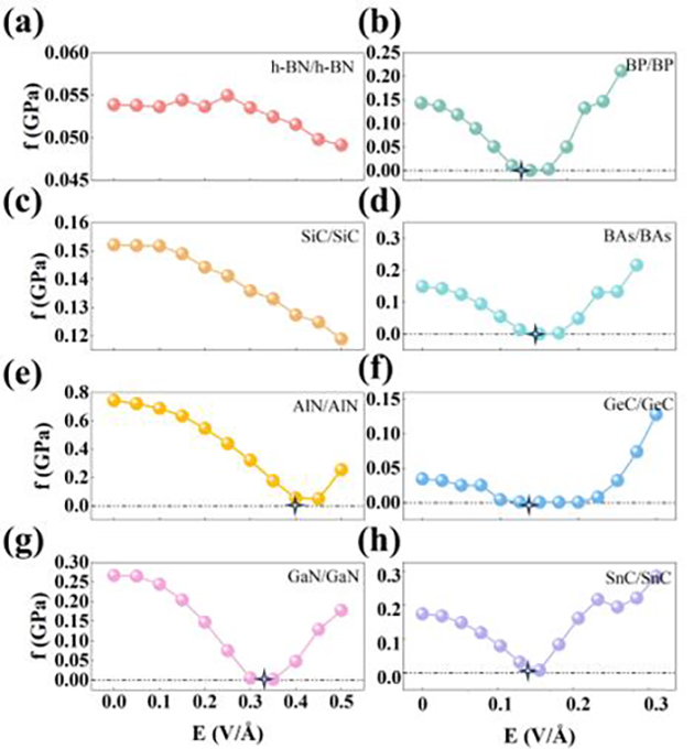 圖3. 8種類(lèi)h-BN材料的摩擦力f與外電場(chǎng)E的關(guān)系。