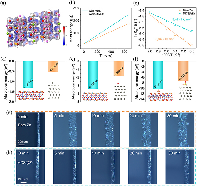 圖3. (a) MDS的靜電勢(ESP)分布圖。(b) 電化學(xué)石英晶體微天平(EQCM)測試中,有無MDS層時電鍍過程的質(zhì)量變化圖。(c) 基于電荷轉(zhuǎn)移電阻計算的裸鋅和MDS@Zn陽極的活化能。(d)、(e)、(f) 分別為Zn2+、H2O和SO42–在裸鋅和MDS陽極(002)晶面上的吸附能圖。(g) 裸鋅陽極和 (h) MDS@Zn陽極在10mA cm–2電流密度下鋅沉積過程的原位光學(xué)顯微鏡圖像。