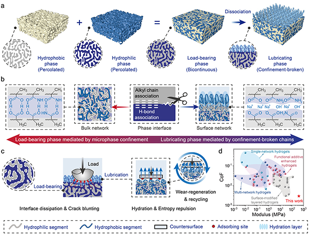 在人體關節(jié)中,軟骨依托多尺度膠原網絡、多相組分及其界面的協(xié)同作用,構建出兼具高承載與超低摩擦的天然潤滑系統(tǒng)。基于這一特性,水凝膠作為有潛力的人工軟骨替代材料備受關注。然而,傳統(tǒng)潤滑水凝膠往往因結構均一性而陷入兩難境地,提高整體網絡致密度雖能增強力學性能,卻會削弱表面水合與潤滑能力;單純追求低摩擦,又會使材料在高載荷下迅速變形、蠕變甚至失效。這種長期存在的性能權衡,嚴重制約了水凝膠在高載荷、長壽命潤滑場景中的實際應用。
