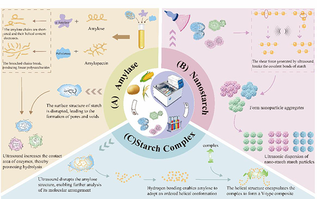 近日,中國科學(xué)院蘭州化學(xué)物理研究所天然藥物與化學(xué)測量研究中心食品化學(xué)與安全檢測團(tuán)隊(duì)發(fā)表了關(guān)于抑制淀粉回生方面的綜述文章,系統(tǒng)總結(jié)了超聲波輔助淀粉改性領(lǐng)域的最新研究進(jìn)展,為綠色、高效的淀粉功能化改性技術(shù)提供了重要參考。該論文深入探討了超聲波參數(shù)優(yōu)化、結(jié)構(gòu)-性能關(guān)系解析及協(xié)同改性策略,展現(xiàn)了超聲波技術(shù)在淀粉改性領(lǐng)域的廣闊前景。