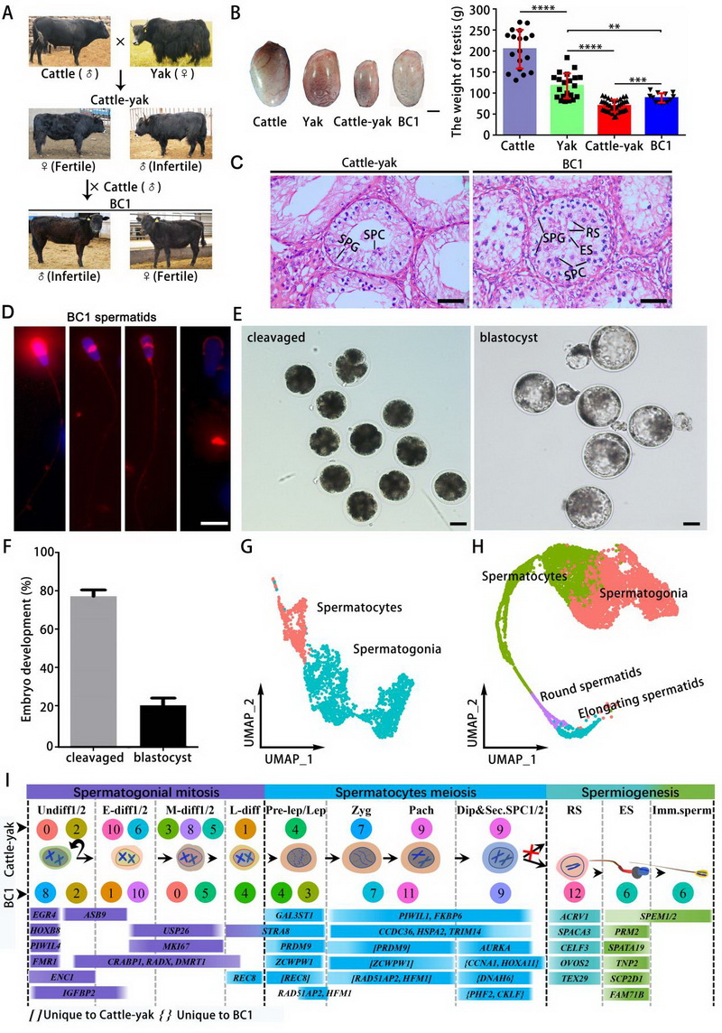 論文代表圖1:普通牛和牦牛雜交后代和回交睪丸組織單細(xì)胞圖譜分析。A) 普通牛與牦牛雜交產(chǎn)生犏牛及其回交后代(BC1)的模型示意圖。B) 牦牛、家牛、犏牛及BC1的睪丸重量對比,比例尺 = 2 厘米;普通牛(n = 18)、牦牛(n = 21)、犏牛(n = 37)和BC1(n = 13)的睪丸重量進(jìn)行兩兩比較。C) 犏牛(左)和BC1(右)睪丸組織的蘇木精-伊紅(H&E)染色切片。比例尺 = 50 μm。在犏牛中未觀察到精母細(xì)胞階段以后的生精細(xì)胞,而與犏牛相比,BC1的生精缺陷有所緩解。SPG:精原細(xì)胞,SPC:精母細(xì)胞,RS:圓形精子細(xì)胞,ES:伸長精子細(xì)胞。D) 從BC1睪丸中分離出的精子細(xì)胞頂體染色。比例尺 = 10 μm。E & F) BC1精子細(xì)胞胞質(zhì)內(nèi)注射入牦牛卵母細(xì)胞后獲得了部分卵裂期胚胎和囊胚期胚胎;比例尺 = 50 μm。G) 犏牛生殖細(xì)胞的UMAP標(biāo)注圖,僅識別出兩種亞型:精原細(xì)胞和精母細(xì)胞。H) BC1生殖細(xì)胞的UMAP標(biāo)注圖,識別出精原細(xì)胞、精母細(xì)胞、圓形精子細(xì)胞和伸長精子細(xì)胞。I) 犏牛和BC1生殖細(xì)胞各簇中特定標(biāo)記基因的表達(dá)情況,可用于細(xì)胞類型鑒定。