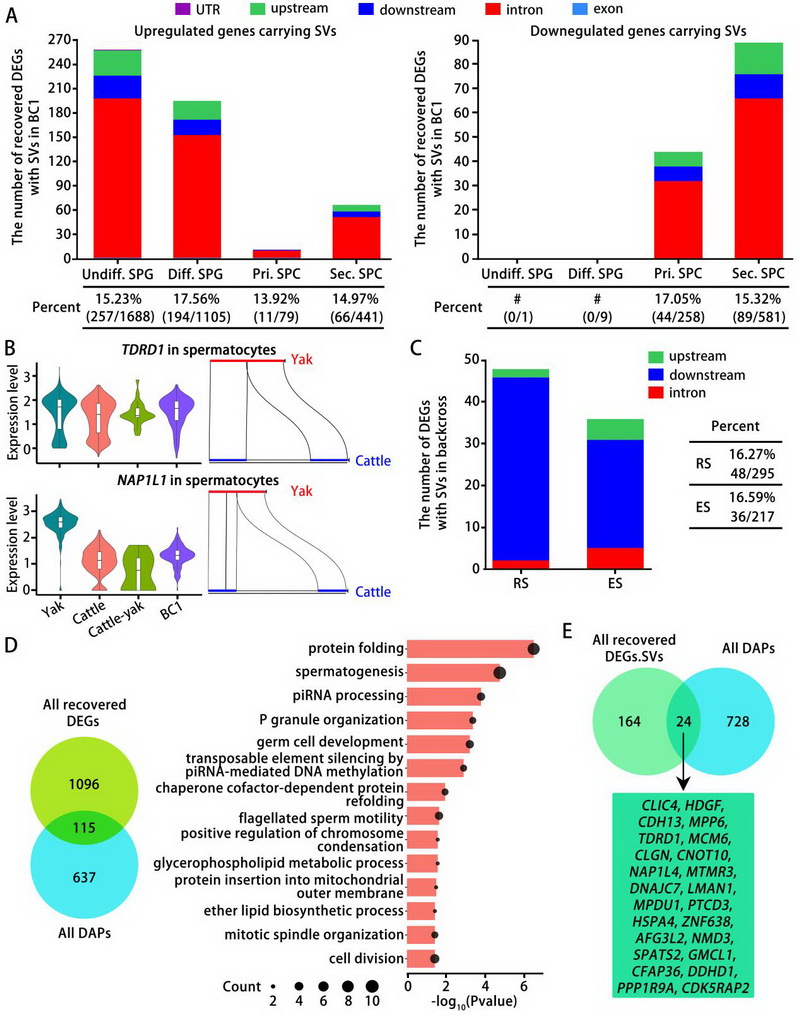 論文代表圖2:普通牛、牦牛、犏牛及BC1各類生殖細(xì)胞亞型中攜帶基因組結(jié)構(gòu)變異的差異表達(dá)基因。A) 柱狀圖顯示在犏牛精原細(xì)胞和精母細(xì)胞各亞群中,具有結(jié)構(gòu)變異且表達(dá)上調(diào)或下調(diào)、但在BC1中表達(dá)得以恢復(fù)的基因數(shù)量。B) 代表性基因的小提琴圖及其結(jié)構(gòu)變異的示意圖。C) 柱狀圖顯示與牦牛和普通牛相比,在BC1各類精子細(xì)胞亞型中攜帶基因組結(jié)構(gòu)變異的差異表達(dá)基因數(shù)量。D) 對BC1精母細(xì)胞中所有表達(dá)水平恢復(fù)的差異表達(dá)基因,與犏牛精母細(xì)胞中的差異豐度蛋白進(jìn)行韋恩圖分析及GO富集分析。E) BC1精母細(xì)胞中所有表達(dá)恢復(fù)的差異表達(dá)基因、具有結(jié)構(gòu)變異的差異表達(dá)基因,以及犏牛精母細(xì)胞中所有差異豐度蛋白的韋恩圖分析。