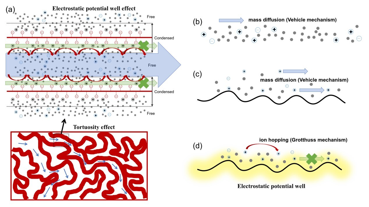 圖1. 迂曲的高電荷密度納米離子傳輸通道內(nèi)的“反離子異常傳輸增強(qiáng)”機(jī)制示意圖及其與其它離子傳輸機(jī)制(純水溶液和之前認(rèn)為的膜內(nèi)離子傳輸機(jī)制)的差異